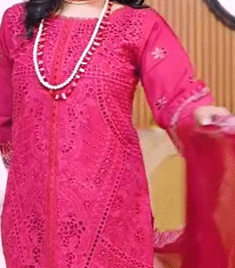 pink 3 piece dress with shifun dupatta and with lace cutwork for women (size:L).
